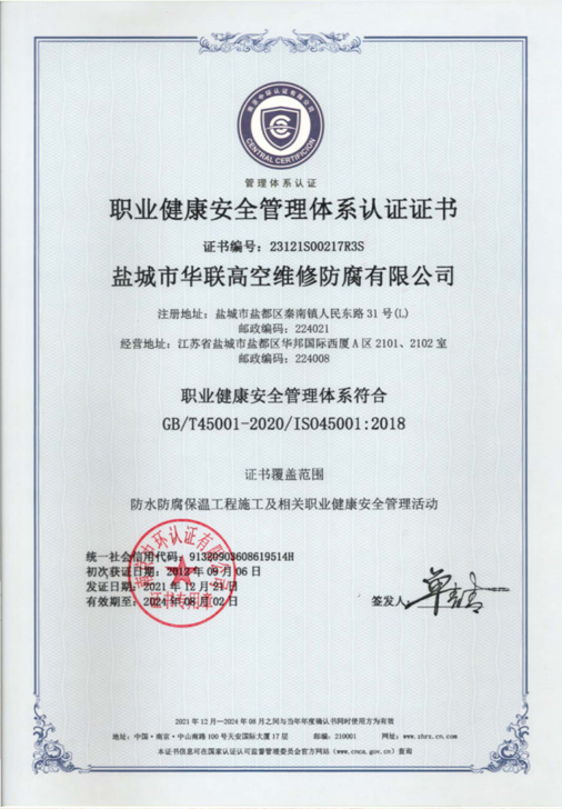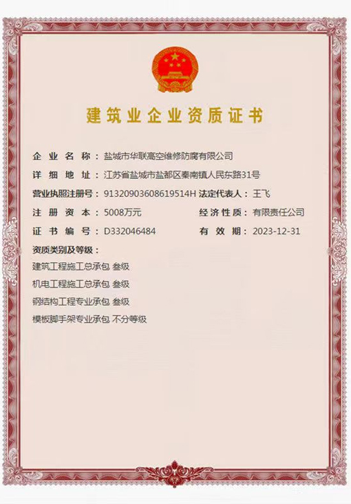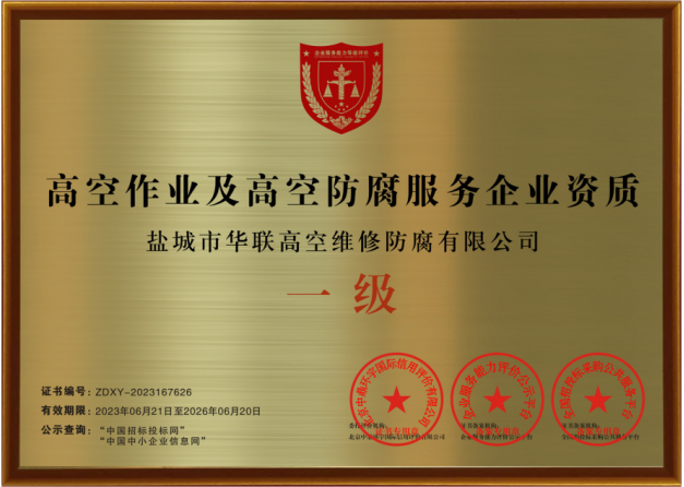 鹽城市華聯(lián)高空維修防腐有限公司始建于上世紀八十年代,系專業(yè)從事風(fēng)力發(fā)電機塔筒防腐,塔筒維護,塔筒補漆,塔筒噴字等工程。不停產(chǎn),不搭手架,高空懸吊施工的一級高空安全資質(zhì)、一級高空防腐施工資質(zhì)、二級建筑施工資質(zhì)的高空建修、防腐工程、公司。現(xiàn)已發(fā)展集科研、設(shè)計、施工為一體的的江蘇省較大的高空建修,高空防腐施工企業(yè);公司注冊資金3008萬元,流動資金8000多萬元;擁有高修技術(shù)科研高修工程設(shè)計、高修工程施工三大技術(shù)與施工組織體系;公司擁有一流的技術(shù)施工隊伍,其中有高級職稱36 名,中級職稱126人。具備一級防腐資質(zhì)、一級安全資質(zhì)及二級建筑資質(zhì),公司下轄五個分公司和十八個辦事處,為全國數(shù)百家企業(yè)解決了若干“高、大、難”的特殊工程項目,填補了我國建筑史上的空白。